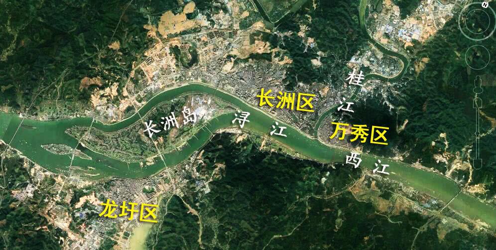 从卫星地图上可以看到,梧州市区就在浔江江畔,北岸有桂江注入。表面上梧州市区是浔江和桂江两江交汇,但是浔江过了交汇处就是西江了,因此也可以说梧州位于浔江、桂江、西江三江交汇处。