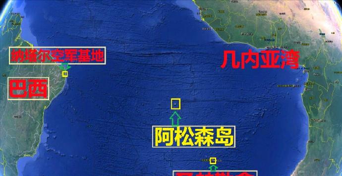 阿松森岛西距巴西1415公里,东南而距南非好望角近2771公里,距几内亚湾石油产区也是1638公里,距离美国波多黎各岛基地3983公里,距离马岛3954公里,如果将美军大西洋海上基地连成一条线,阿松森岛恰巧为中心。