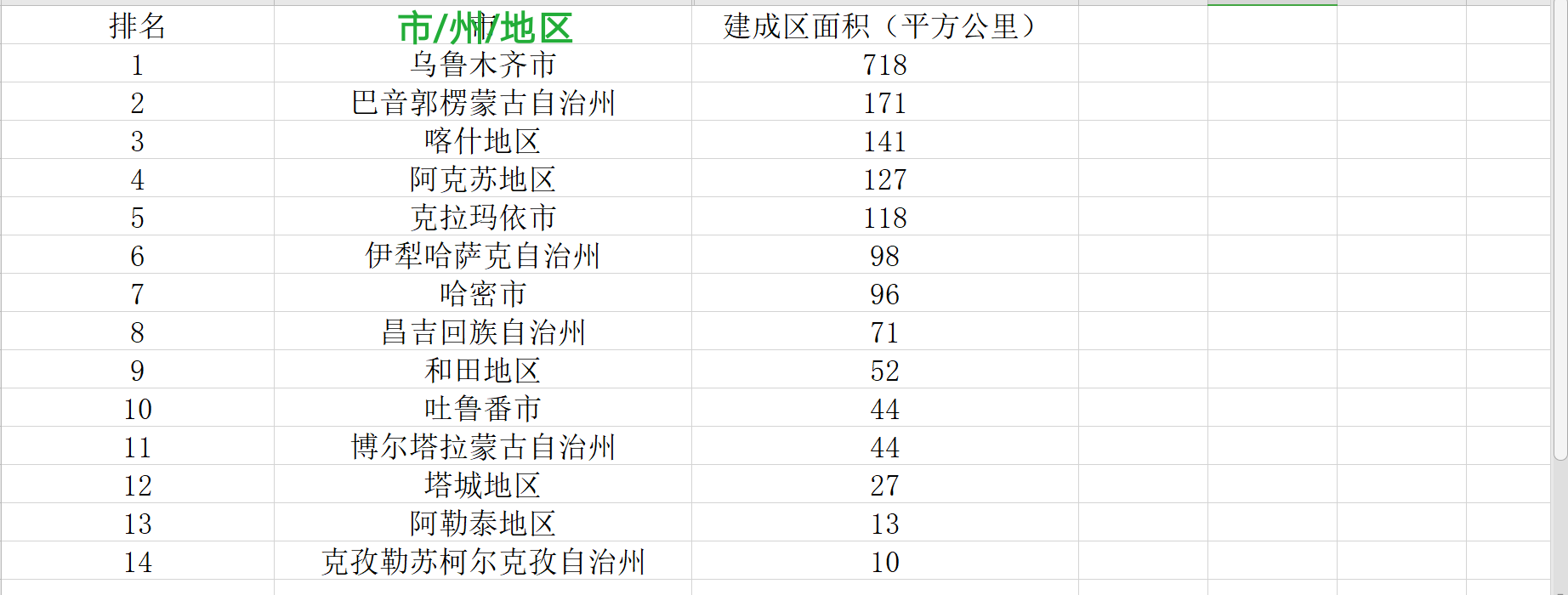 新疆各地建成区面积排名表