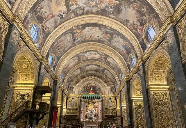 大教堂整体呈现了华丽的巴洛克式风格,墙壁上的雕刻交错呈现,手工技艺精湛的大理石雕刻作品,高耸的圆拱顶上描绘着骑士团生活场景的巨幅壁画,以及著名艺术壁画——《圣若望被斩首》,参观一次真的相当开眼。其实,在全世界有好几个圣约翰大教堂,如香港、纽约和拉特兰,但最著名、最辉煌的还是瓦莱塔的这一座!