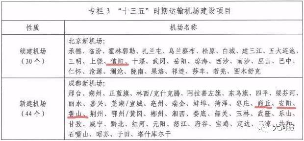 “十三五”期间全国续建、新建机场项目74个。河南这四个地方将新建、续建机场:其中续建机场有信阳;新建机场有商丘、安阳、鲁山;改扩建机场有河南郑州、洛阳、南阳。