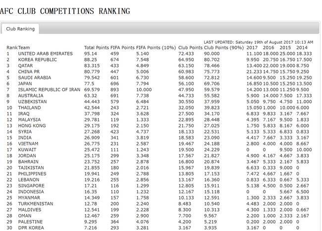 【导读】亚足联官方更新了各会员国技术分以及排名,阿联酋、韩国、卡塔尔占据前3位。中国领先沙特、日本,中国暂时排名亚洲第4位、东亚区第2位。如果在今年亚足联技术分年终排名中,中国能够保住东亚区第2位的位置,那么2019赛季、2020赛季中国的亚冠名额将会是“3+1”,也就是3个正赛名额和1个资格赛名额。